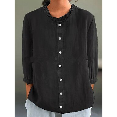 Γυναικεία Πουκάμισο Μπλούζα Λινό από ψεύτικο βαμβάκι Κεντητό Κουμπιά Συμπαγές Χρώμα Στυλάτο Καθημερινό 3/4 Μήκος Μανικιού Στρογγυλή Ψηλή Λαιμόκοψη Κανονικά μπλουζάκια Καθημερινά