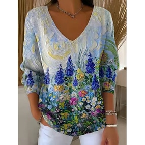 Γυναικεία Μπλούζα Φλοράλ Γραφική Βίντατζ Στυλάτο Κλασσικό 3/4 Μήκος Μανικιού Λαιμόκοψη V Κανονικά μπλουζάκια Καθημερινά Θαλασσί Ανθισμένο Ροζ Βυσσινί Καλοκαίρι Άνοιξη
