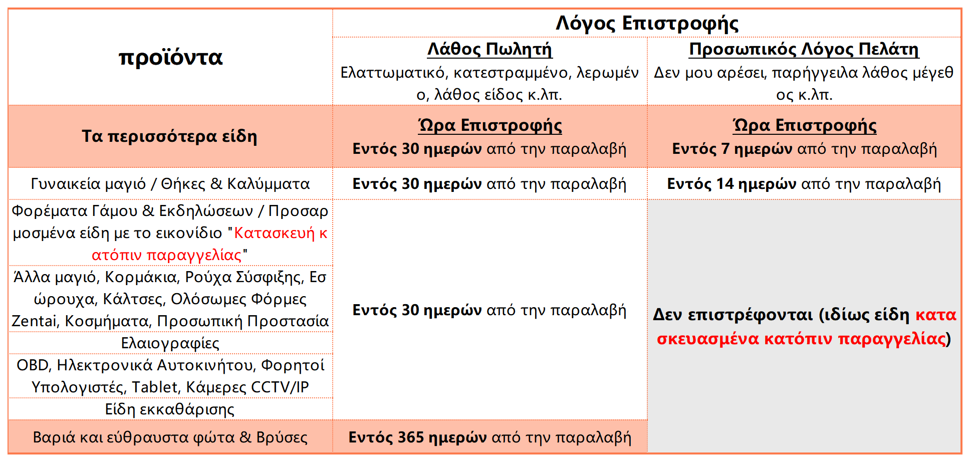 3. Τα αντικείμενα εκτός του παραθύρου επιστροφής δεν μπορούν να επιστραφούν εκτός αν δεν συμμορφώνονται με τους υποχρεωτικούς κανόνες και κανονισμούς σας.