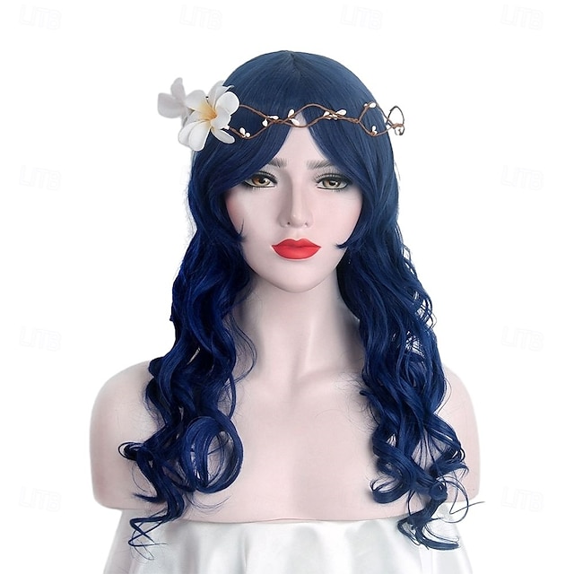 [Σημεία Σχεδίασης]: Αυτό το σκοτεινό μπλε τριχιάμι διαθέτει καταρρακτώδεις μπούκλες και μια διακριτική, κυματιστή υφή που θυμίζει φανταστικούς χαρακτήρες. Το προαιρετικό λουλούδι στο κεφάλι με λεπτά λευκά λουλούδια προσθέτει μια μαγευτική πινελιά, ενισχύοντας την αιθέρια γοητεία του.