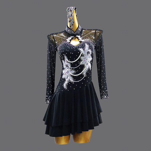 Φόρεμα λάτιν χορού με στρας, γυναικείο φόρεμα παράστασης, προπόνηση με μακριά μανίκια, ρούμπα σάλσα τσάτσα, κοστούμια χορού για σκηνή