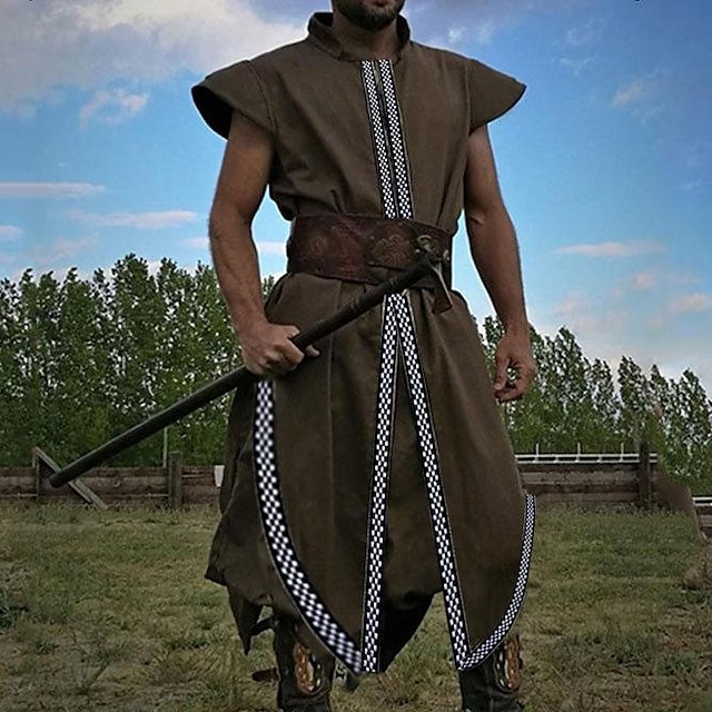 [Υλικό] Κατασκευασμένο από ένα ανθεκτικό μείγμα πολυεστέρα και βαμβακιού, αυτό το ανδρικό σετ γιλέκου και μανδύα εξασφαλίζει άνεση και μακροχρόνια χρήση, κατάλληλο για φορέσεις σε όλες τις εποχές. Το πλούσιο μαύρο ύφασμα προσθέτει αυθεντική μεσαιωνική γοητεία, κάνοντάς το τόσο πρακτικό όσο και οπτικά ελκυστικό. [Σιλουέτα] Το ρούχο διαθέτει μια ρέουσα, μακριά τούνικα που εκτείνεται κάτω από τα γόνατα, με χαλαρό αλλά καλοραμμένο κόψιμο που επιτρέπει ευκολία κινήσεων. Σχεδιάζεται ώστε να κολακεύει διάφορους τύπους σώματος, διατηρώντας ταυτόχρονα μια τολμηρή και αυτοπεποίθηση σιλουέτα. [Σημεία Σχεδίασης] Αυτό το κομμάτι εμπνευσμένο από το Μεσαίωνα παρουσιάζει ένα ανοιχτό μπροστινό μέρος με περίπλοκα διακοσμημένα περιθώρια, προσθέτοντας κομψότητα και λεπτομέρεια στο σύνολο. Οι κοντές α sleeves αναδεικνύονται από επικαλυπτόμενους ώμους, δίνοντας μια δομημένη, πολεμιστική εμφάνιση. Μια φαρδιά ζώνη με διακοσμητικές μεταλλικές λεπτομέρειες σφίγγει τη μέση, ενισχύοντας την ιστορική αισθητική του συνόλου. [Ιδανικές Περιστάσεις] Ιδανικό για διάφορες περιστάσεις, αυτή η κοστούμι είναι κατάλληλη για θεματικές εκδηλώσεις, θεατρικές παραστάσεις, ιστορικές αναπαραστάσεις και cosplay περιπτώσεις όπως το Χάλοουιν, οι Καρναβαλικές γιορτές και οι Μασκαράδες. Ο ρετρό vintage στυλ του ενσωματώνει την ουσία των χαρακτήρων των Βίκινγκς, των Σταυροφόρων και των Κελτών Ιπποτών. [Μέγεθος] Διαθέσιμο σε μεγέθη M, L, XL, 2XL, 3XL, και 4XL, εξασφαλίζοντας εφαρμογή για ευρύ φάσμα τύπων σώματος.