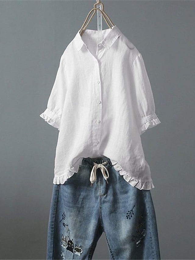Γυναικεία Πουκάμισο Βαμβακερά λινά πουκάμισα Μπλούζα Λινό από ψεύτικο βαμβάκι Κουμπιά Σκέτο Βασικό Μοντέρνα Κοντομάνικο Κολάρο Πουκαμίσου Κανονικά μπλουζάκια Καθημερινά Αργίες Εξόδου