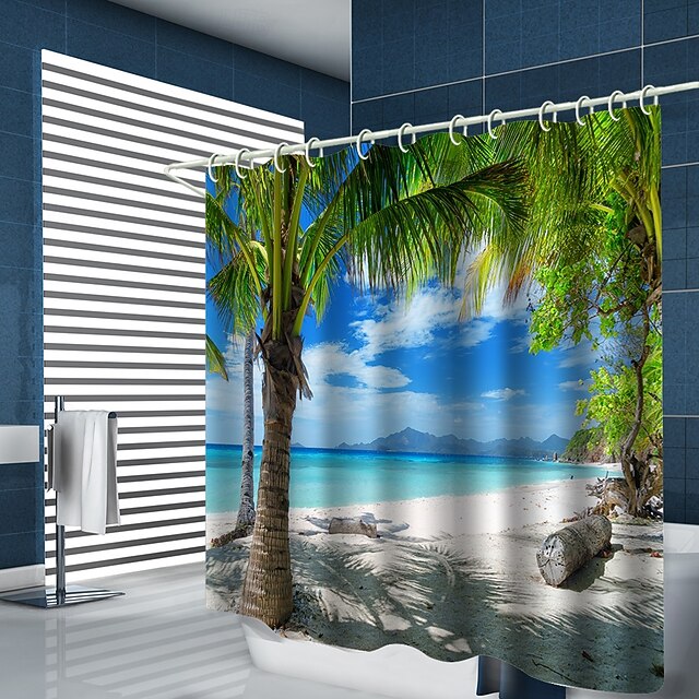 וילון מקלחת מודרני פוליאסטר עיבוד שבבי עמיד למים אמבטיה עם וו הדפסה על נוף צמחי מים ים