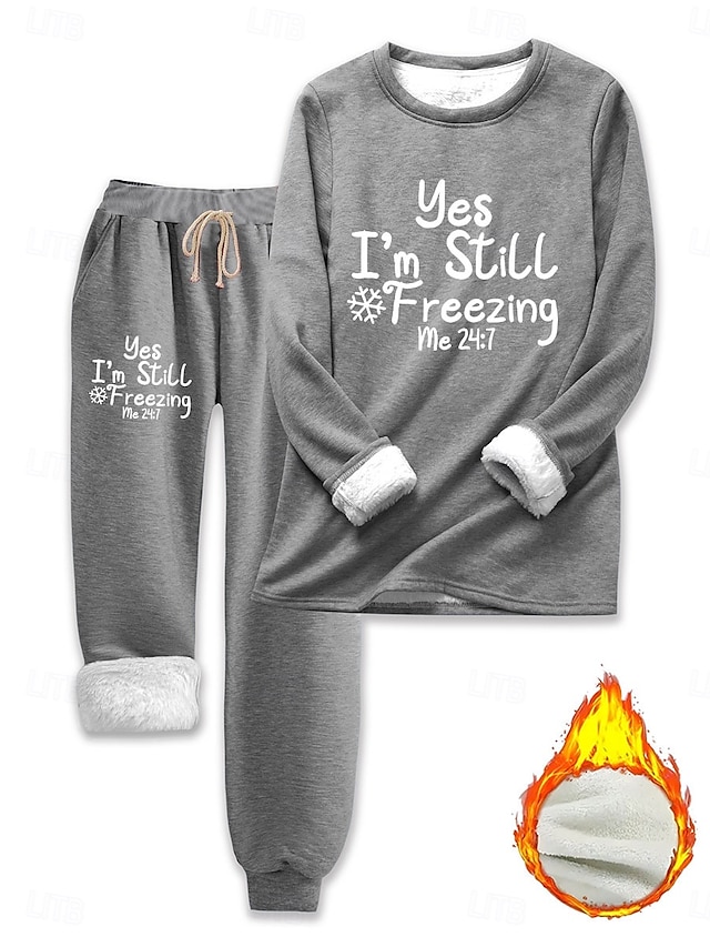 סט פיג'מות לנשים עם בטנת פליז 2 חלקים סווטשירט ומכנסי פלי חם נוח רך סווטשירט עם שרוול ארוך מכנסיים ארוכים צווארון עגול הדפס אותיות מותן אלסטית ביתי יומיומי מיטה ורוד כהה כחול אפור סתיו