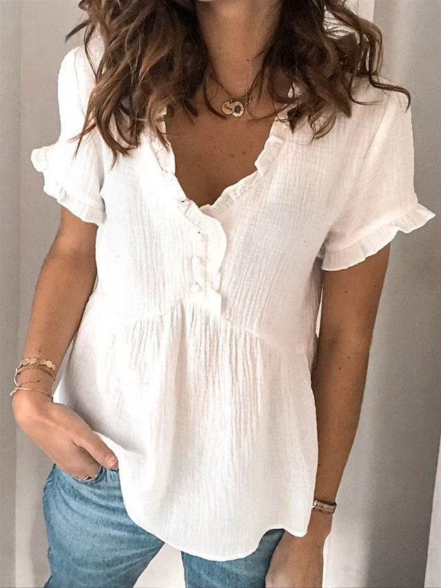 בגדי ריקוד נשים חולצה צמרות קיץ צבע אחיד יום יומי סגנונות חוף שרוולים קצרים צווארון V חולצות רגילות בז' קיץ