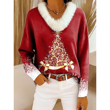 טי-שירט חג המולד לנשים עם עץ חג המולד וגרפיקת שלג אופנה טרופית עם שרוולים ארוכים צווארון V צבעים שחור אדום ירוק סתיו חורף