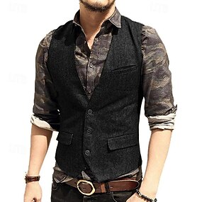 Men's Vest Gilet Daily Wear Vacation Going out Vintage Fashion Spring & Fall Button Polyester Comfortable Plain Single Breasted V Neck Regular Fit Dark Gray Light Grey Coffee Vest