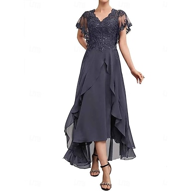 A-vonalú Menyasszony Anyukája Ruha Elegáns Egyszerű V Nyakú Aszimmetrikus Chiffon Rövid Ujjú Egyszínű