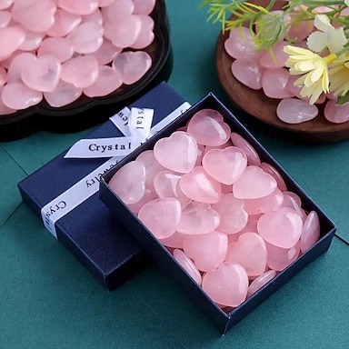 Valentin napi szív alakú kő díszdoboz, 2 cm-es rózsakvarc szívkő, natúr őszibarack rózsakvarc, szív alakú kristálykő díszdobozban, romantikus ajándék szerelmeseknek