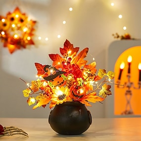 halloweeni őszi asztali dísz műtök, juharlevelek, fenyőtobozok és LED-es lámpák aratófesztivál dekorációhoz halloweenhez, hátborzongató őszi látvány, őszi lakberendezés