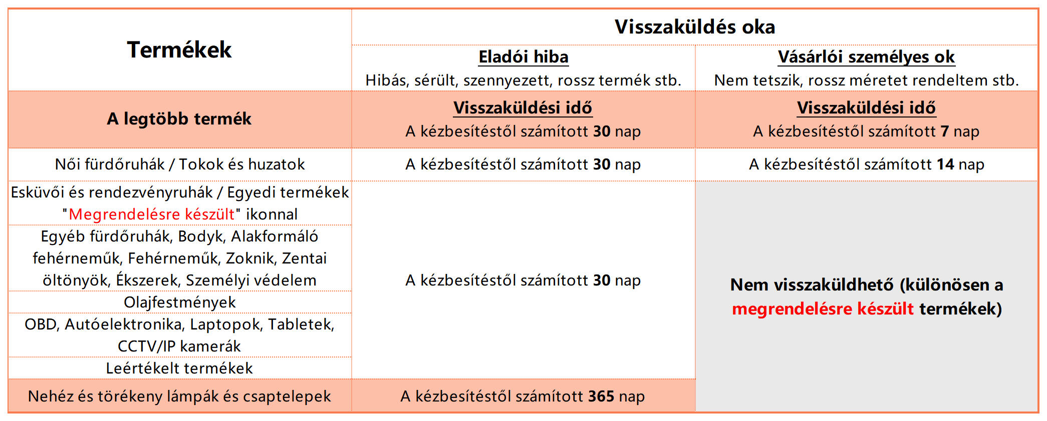 Kivéve néhány egyedi rendelésre készült, testreszabott vagy különleges terméket, amelyeket az Ön helyi országára vagy régiójára vonatkozó jogszabályok előírnak,a termékek túlnyomó többsége visszaküldhető. Azonban a konkrét feltételek attól függnek, hogy miért kívánja visszaküldeni a terméket, valamint annak típusától. Kérjük, tekintse meg az alábbi táblázatot részletekért.