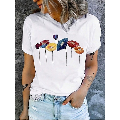 Női Póló Pamut póló Nyomtatott Virágos Grafika Alkalmi Rövid ujjú Kerek Normál felsők Napi Fehér Nyár