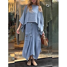 női 100% pamut ing, lenvászon ihlette szettek, kétrészes szettek, len nadrág, nadrágszár rövid ujjú, v nyakú, egyszínű, divatos, utcai viselet, hétköznapi viselet, randizöld, khaki, világoskék, tavaszi, normál szabású