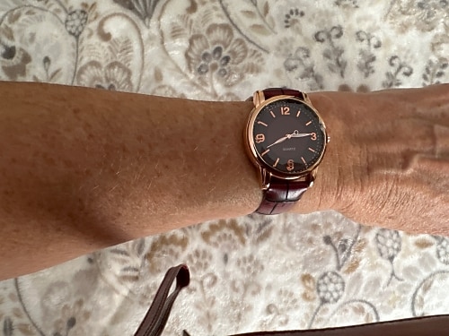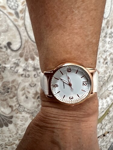 I’m so glad I ordered this watch!! I ordered 3 and I’m very pleased with each one! This fits nicely and will be a wonderful addition to outfits. I haven’t worn a watch in years and I’m so happy I came across all of these! The watch I used to have had a tiny face. I loved it and didn’t think I’d ever like a larger one but I’m so glad I did!! I will definitely get a lot of use of this! Keeps time perfectly and was very easy to set the time and wind it. I do wish the closure silver was the same color as the watch facerose gold. This one I can hear the second hand ticking ~ not at all bothersome. I’m so glad I ordered this watch!! I ordered 3 and I’m very pleased with each one! This fits nicely and will be a wonderful addition to outfits. I haven’t worn a watch in years and I’m so happy I came across all of these! The watch I used to have had a tiny face. I loved it and didn’t think I’d ever like a larger one but I’m so glad I did!! I will definitely get a lot of use of this! Keeps time perfectly and was very easy to set the time and wind it. I do wish the closure silver was the same color as the watch facerose gold. This one I can hear the second hand ticking ~ not at all bothersome.