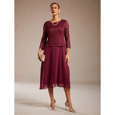 Per donna Abito Midi Abito a trapezio Elegante Festa serale Ospite di nozze Pizzo Vestibilità regolare Tinta unica Manica 3/4 Girocollo Vino