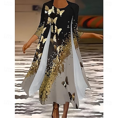 Per donna Insieme del vestito Abito Estivo Vacanza Casual Ombre Floreale Stampato Abito maxi Manica 3/4 Girocollo Quotidiano Ospite di nozze Nero Azzurro cielo Blu scuro Estate Primavera Vestibilit