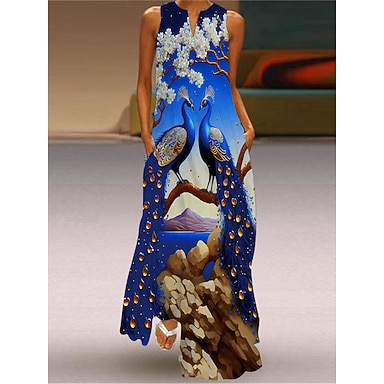 Per donna Abito lungo maxi Abito Midi Vestito Casual Vestito T-Shirt Abito Stampato Streetwear Casual All'aperto Vacanza Uscire Vestibilità regolare Floreale Pavone Pesce Senza Maniche Scollo a V