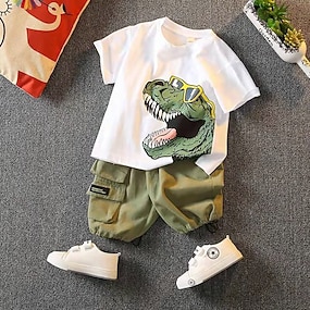 2 pezzi Bambino (1-4 anni) Da ragazzo T-shirt e pantaloncini Vestito Dinosauro Manica corta Cotone Impostare Esterno Di tendenza Giornaliero Estate Primavera 3-7 anni Bianco Giallo