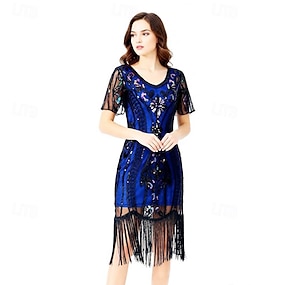 Anni Ruggenti Anni 1920 Lunghezza al ginocchio Abito Flapper Abiti Maniche corte Il grande Gatsby Invitato al matrimonio Paillettes Frangia con nappe Scollo Tondo Costume Per donna Natale Carnevale