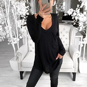 Per donna maglietta Tunica Nero Bianco Rosa Tinta unita Tasche Manica lunga Informale Giornaliero Essenziale A V Standard Morbido S