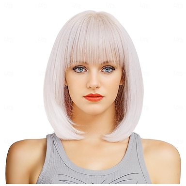 Parrucca Bob con Frangia Parrucca Corto Bianca Parrucca Bob per Donne Parrucca Liscia con Frangia 10 Pollici Resistenti al Calore Capelli Sintetici Dall'Aspetto Naturale per Uso Quotidiano e Festa
