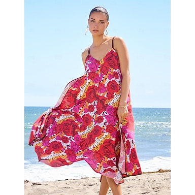 Per donna Abito con spalline Vestito Estivo Abito Estivo Abito Midi Rosso Con fibbia Stampa Rosa Fiori Scollo a V Stampato Orlo asimmetrico Primavera & Estate Scollo a V Sexy Scollo a V Abito da