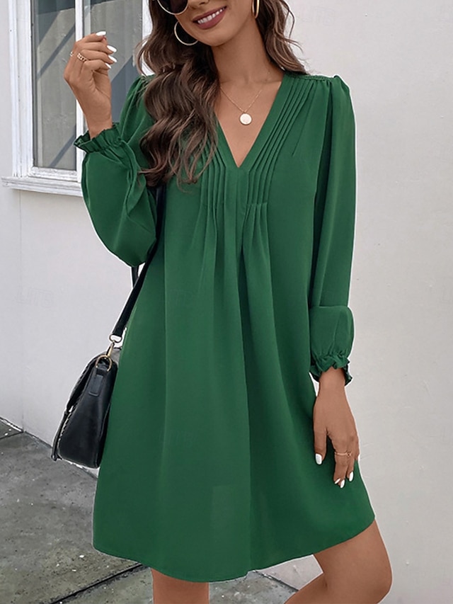 Per donna Abito casual Mini abito Increspato Informale A V Manica lunga Verde Colore