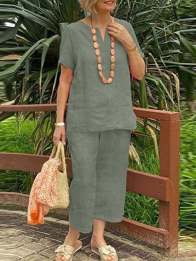 Per donna Misto cotone Set ispirati al lino Set da due pezzi Pantaloni di Lino Manica Corta Tinta unica Bianco Arancione Verde Estate Vestibilità regolare