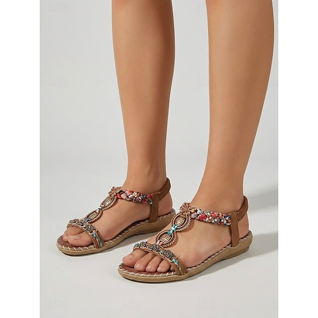 Sandali piatti da donna color marrone caffè con perline - comodi sandali boho con inserti di gemme per vacanze al mare e visite turistiche all'aperto &abbigliamento per vacanze tropicali