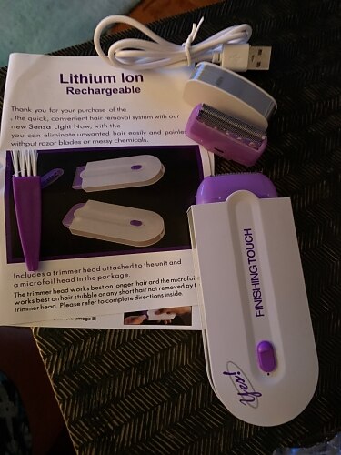 Hair removal with a sensa light. You switch it on and it will flash, the motor will start when you touch your skin, and the light stays on while you shave. USB charger. Stays charged for ages. Doesnt rip your skin.Good for light facial hair, moles, arms, bikini, under arms etc.. Not for thick bushy muff.. Use regularly, keep it in good condition using the cleaning brush. Great for traveling. Hair removal with a sensa light. You switch it on and it will flash, the motor will start when you touch your skin, and the light stays on while you shave. USB charger. Stays charged for ages. Doesnt rip your skin.Good for light facial hair, moles, arms, bikini, under arms etc.. Not for thick bushy muff.. Use regularly, keep it in good condition using the cleaning brush. Great for traveling.