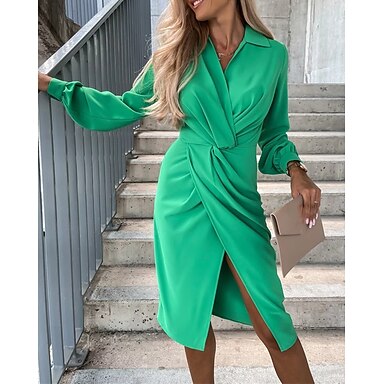 Per donna Abito da lavoro Vestito tubino Elegante Ufficio Giornaliero Vestito longuette Increspato Spacco A V Manica lunga Liscio Standard Nero Bianco Cachi Autunno S M L XL 2XL