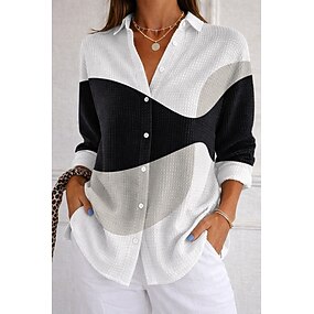 女性用 シャツ ワッフルシャツ カジュアルシャツ ボタン グラフィック 幾何学模様 ヴィンテージ スタイリッシュ 長袖 レギュラートップス 日常 アウトドア ストリートウェア ブラックとホワイト 白+黒 ホワイト(多色模様付き) 夏 春 秋 冬