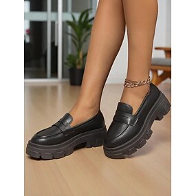 レディース チャンキー プラットフォーム ローファー - カジュアル&オフィスウェアに最適なブラック スリッポン ラウンドトゥ ラグソール シューズ