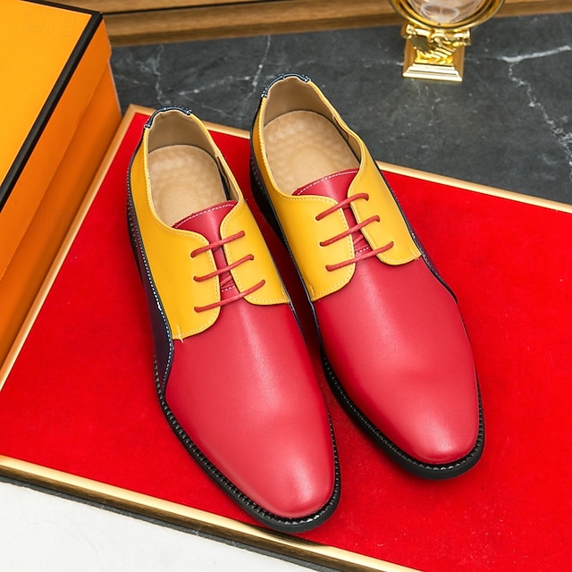 男性用プロムシューズ、カラフルな赤、黄、緑のレースアップオックスフォード、鮮やかなフォーマルな機会にぴったりの大胆なスタイル