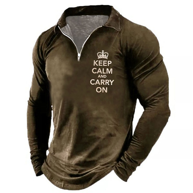 男性用長袖グラフィックTシャツ「落ち着いて、続けなさい」クォータージップ