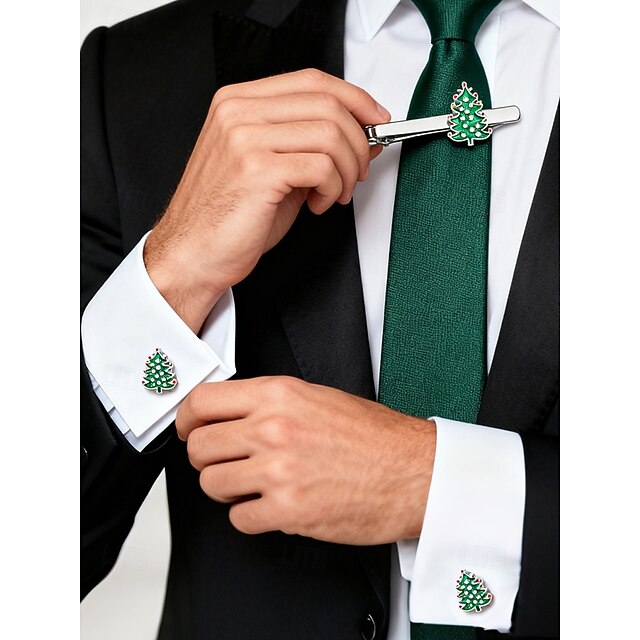 2026年 メンズのクリスマスツリーカフスボタンとネクタイピンセット - クリスマスパーティーや特別な機会にぴったりの、グリーンのエナメルとクリスタルのディテールが施された、華やかなホリデージュエリーセット  コレクション – $11.99 –P1