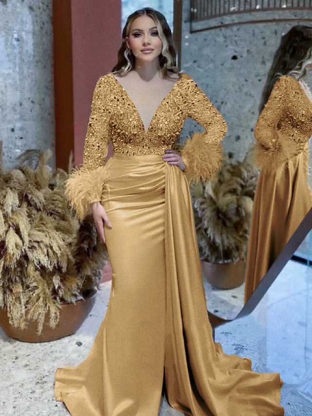トランペット/マーメイド コートトレーン イブニングドレス オーバースカート付きボールガウン フォーマルドレス エレガント きらきら&ピカピカ 長袖 Vネック 結婚式 フォーマル サテン スパンコール とともに フェザー グリッター素材 フリル