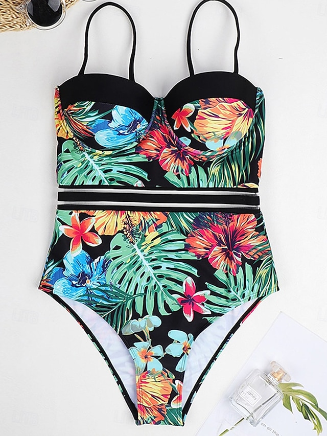 女性用 スイムウェア ワンピース 水着 ジッパー メッシュ バックレス 旅行度假风 トロピカル風 フラワー グラフィック ホルターネック ノースリーブ 水着