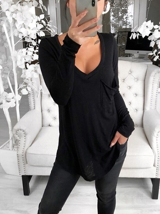 女性用 Tシャツ チュニック ブラック ホワイト ピンク ソリッド ポケット 長袖 カジュアル 日常 ベーシック Vネック レギュラー ルーズフィット S