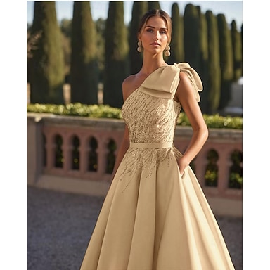 Aライン アシメントリー イブニングドレス ボールガウン フォーマルドレス エレガント ヴィンテージ きらびやかな ノースリーブ ワンショルダー フォーマル 結婚式 サテン とともに 刺繍 アップリケ 2025