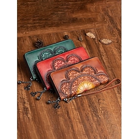 handgemaakte leren continentale portemonnee met elegant mandala-patroon - ritssluiting, meerdere compartimenten, ideaal cadeau voor vrouwen op Moederdag