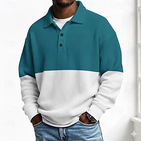 Voor heren Kleurenblok Wafel Poloshirts Met Textuur Lange mouw Poloshirt Revers Casual School Sportkleding Alledaagse kleding 3D-afdrukken Herfst winter blauw Bruin Groen