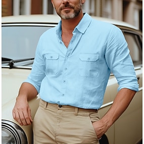 Voor heren Overhemd Katoenen linnen overhemd Zomer overhemd Overhemd met knopen Effen Casual Dagelijks Zwart Wit blauw Khaki Lange mouw Kraag Lente zomer Kleding Zak