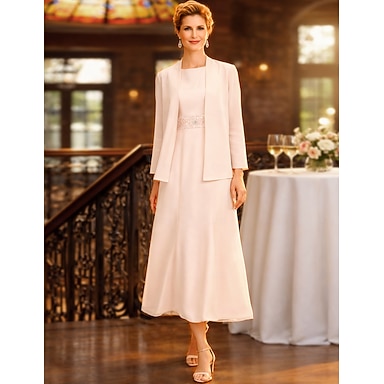 Tweedelig Strak kolom Tot de knie Bruiloft gast jurk Moeder van de bruid jurk 3/4 mouw Met sieraad Elegant Formeel Bruiloft gast Kerk (83 Chiffon Kant Wrap inbegrepen Jas Jurken met Kralen Appliqués