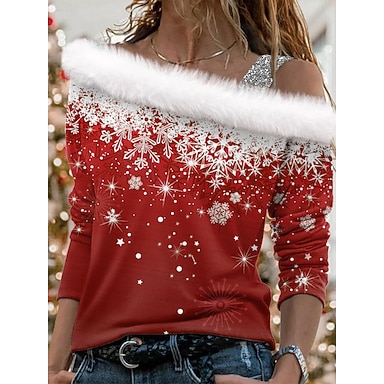 Kerstmis Dames T-shirt Grafisch Sneeuwvlok Vintage Stijlvol Basic Lange mouw V-hals Schouderafhangend Normale tops Weekend Afdrukken Assymmetrisch Rood blauw Paars Groen Winter Lente, Herfst