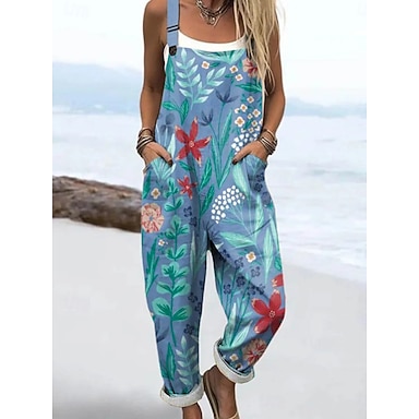 Dames Normaal Jumpsuit Streetwear Bloemig Mouwloos U-hals Zak Afdrukken Straat Dagelijks Normale pasvorm Zwart Wit blauw Zomer