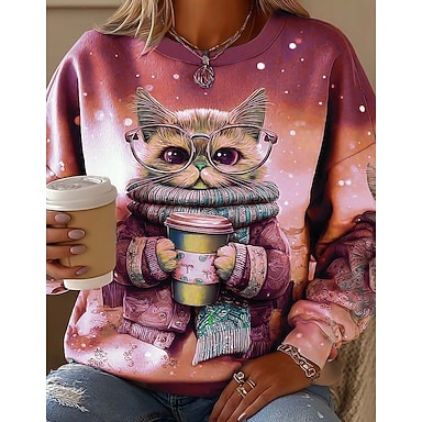 Dames Sweatshirts Grafisch dier Kat Casual Lange mouw Strakke ronde hals Normale tops Straat Dagelijks gebruik Casual Afdrukken Blozend Roze blauw Paars Khaki Lente Herfst Winter