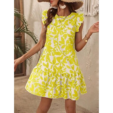 Dames Mini-jurk Vintage Jurk Boho-jurk Bohemen Vintage Stijlvol Vakantie Dagelijks Ruim Passend Bloemig Korte mouw V-hals Geel Zomer