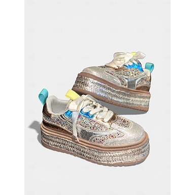 Sprankelende zilveren platform sneakers voor dames - kleurrijke glitter veterschoenen voor verjaardagsfeestjes, uitgaan en informele gelegenheden.